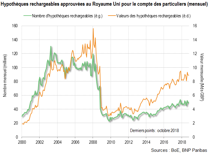 Le découplage croissant entre les données en volume et celles en valeur, observable depuis début 2013, est imputable à la croissance des prix de l’immobilier résidentiel (+17% selon l’ONS entre janvier 2013 et octobre 2018). Les hypothèques rechargeables comptent ainsi désormais pour plus d’un tiers de la totalité des nouveaux prêts accordés aux particuliers.