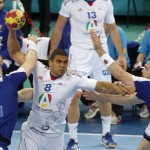 France’s Daniel Narcisse attemps to score against Iceland’s Vignir Svavarsson and Asgeir Orn Hallgrimsson during the World Men’s Handball Championship at Palau Sant Jordi arena in Barcelona