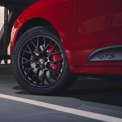 Le dynamisme du nouveau Macan GTS s’exprime également à travers son design tout en sportivité. Le pack Sport Design fourni de série, qui se compose des nouveaux boucliers avant et arrière et des jupes latérales au caractère affirmé, souligne le style unique du SUV compact. La jupe et le bouclier avant sont ornés d’éléments peints en noir, une caractéristique commune à toutes les versions GTS chez Porsche. Les phares à LED avec Porsche Dynamic Light System (PDLS) et les feux arrière en relief avec bandeau lumineux à LED bénéficient également d’un design aux tons sombres. Les phares à LED en noir avec PDLS Plus sont disponibles en option. Le surbaissement du châssis de 15 mm, les jantes 20 pouces « RS Spyder Design » en Noir (finition satinée), les étriers de freins en Rouge et les inserts en Noir (finition brillante) soulignent l’esthétique résolument sportive du Macan GTS. La poupe arbore également des éléments peints en Noir, notamment le diffuseur et les sorties de l’échappement sport fourni de série.