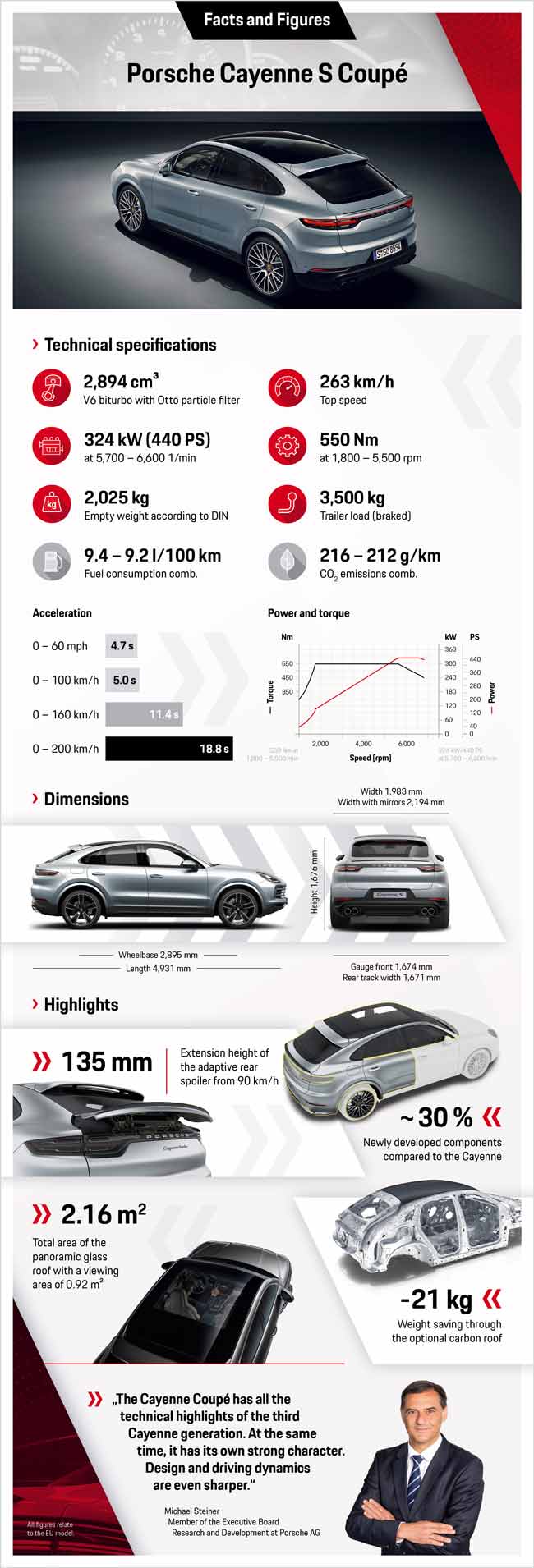 Le moteur biturbo de 2,9 l du Cayenne S Coupé délivre un couple maximal de 550 Nm sur toute la plage de régime (de 1 800 à 5 500 tr/min). Les deux turbocompresseurs sont disposés au centre du V que forment les rangées de cylindres, une configuration baptisée Central Turbo Layout. Le moteur étant plus compact, il peut être monté dans une position plus basse. L’abaissement de la position du moteur fait descendre le centre de gravité de la voiture et améliore ainsi la dynamique latérale. Cette implantation centrale, qui raccourcit la distance entre les chambres de combustion et les turbocompresseurs, permet de bénéficier d’une plus grande spontanéité à l’accélération et d’une montée en puissance plus rapide. Par ailleurs, le collecteur d’échappement est intégré à la culasse, ce qui présente deux avantages majeurs : un gain en poids et un refroidissement plus efficace. Ainsi, le collecteur intégré permet d’assurer, notamment à pleine charge, une combustion à très haute efficacité.