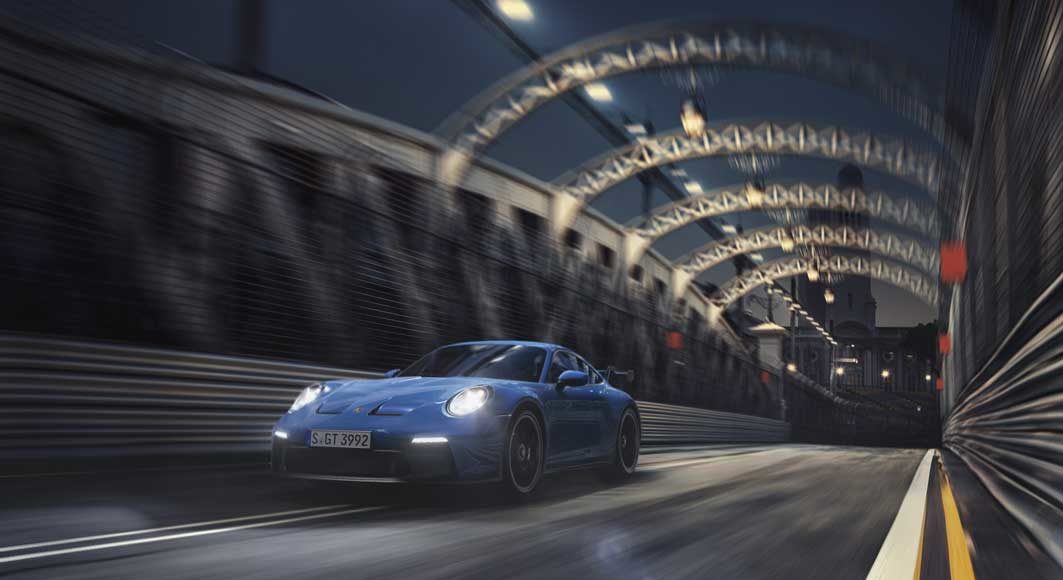La 7e édition de la sportive haute performance, développée en étroite collaboration avec le département Compétition de la marque, Porsche Motorsport, constitue un modèle de transfert de technologies de la course automobile à la production de série. L’essieu à double triangulation à l’avant, l’aérodynamique optimisée avec aileron arrière à fixation en col de cygne et l’imposant diffuseur sont issus de la 911 RSR, le modèle de course qui a remporté de nombreux succès en catégorie GT. Son moteur à plat six cylindres de quatre litres de cylindrée, qui développe 510 ch (375 kW), est une déclinaison du groupe motopropulseur de la 911 GT3 R, qui a fait ses preuves dans les compétitions d’endurance. Ce bloc à haut régime, à la sonorité caractéristique, est également utilisé sur la nouvelle 911 GT3 Cup. Avec une telle filiation, la 911 GT3 est une sportive à la pointe de la technique, souveraine sur circuit et parfaitement à l’aise sur les routes pour les trajets du quotidien.