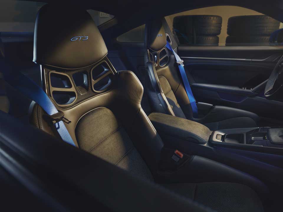 Les clients des modèles GT demandent de plus en plus d’équipements personnalisés. Ainsi, les équipements Porsche Exclusive Manufaktur, l’offre de personnalisation de la marque, sont également disponibles sur la nouvelle 911 GT3, notamment le pavillon de conception légère en fibres de carbone (finition carbone apparent). La voiture est également dotée de rétroviseurs extérieurs en carbone, de phares matriciels à LED avec blocs optiques teintés et des feux arrière assortis Exclusive Design. Les lisérés Rouge Indien ou Bleu Requin sur les contours des jantes mettent en valeur la finition Noir des jantes en alliage léger.