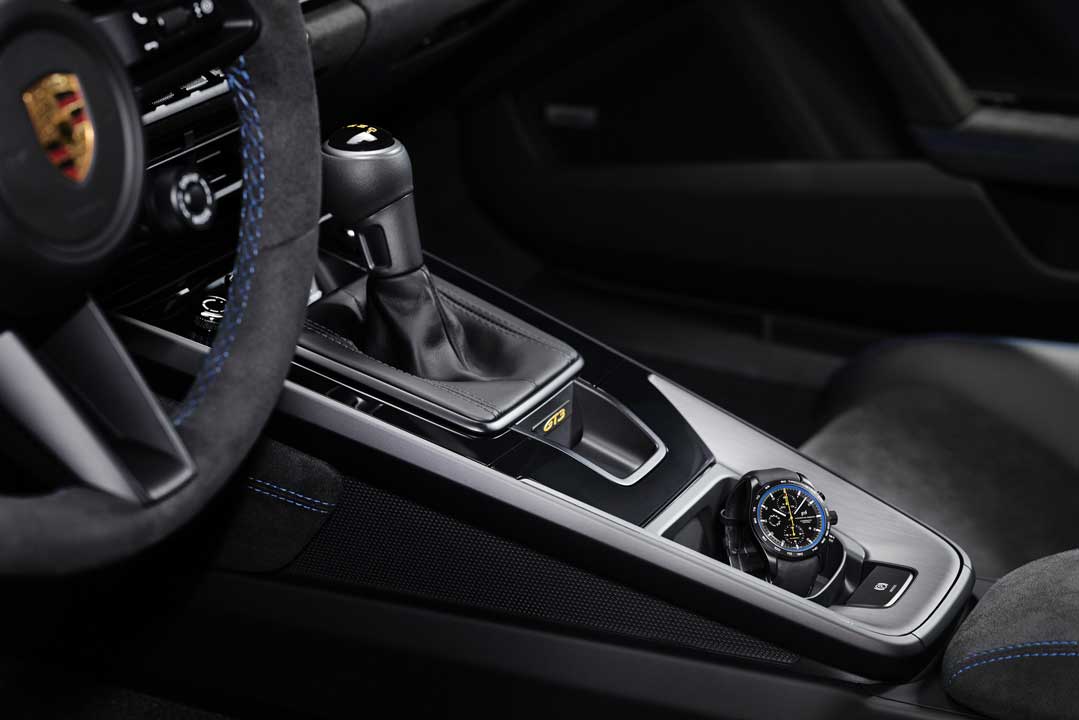 Le chronographe individuel proposé par Porsche Design est aussi exclusif que la 911 GT3, pour le plus grand plaisir des amoureux de sportivité. Son boîtier évoque la course automobile. Comme les bielles du moteur de la GT3, il est fabriqué en titane, un matériau qui allie robustesse et légèreté. L’armage du ressort de la montre est assuré par une masse oscillante qui n’est pas sans rappeler les jantes de la 911 GT3. La couleur de la graduation sur le cadran peut être harmonisée avec les teintes de la 911 GT3.