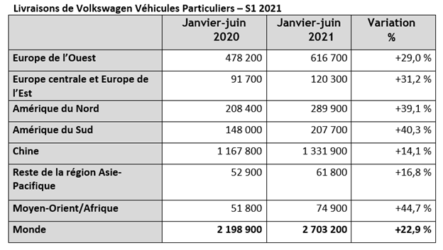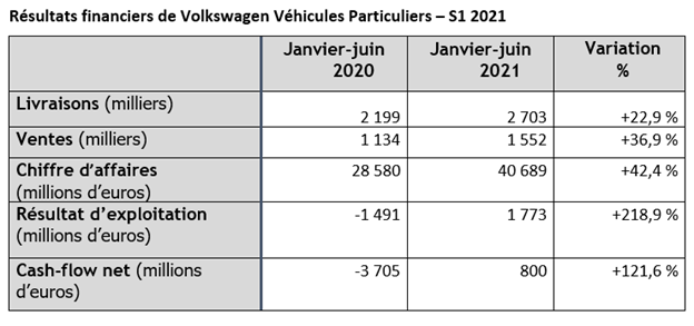Volkswagen termine le premier semestre 2021 sur une note positive grâce à une gestion de crise efficace, à une stricte discipline de coûts et à la mise en œuvre systématique de sa stratégie ACCELERATE. Malgré la pandémie de coronavirus et la pénurie de semi-conducteurs, le nombre de véhicules livrés dans le monde atteint 2,7 millions, soit 500 000 de plus que l’année précédente. Cette hausse est, en partie, due à une gestion intelligente des entrepôts et de l’approvisionnement. La part de marché s’améliore également dans pratiquement toutes les régions. Le chiffre d’affaires progresse de 42% par rapport à l’année précédente pour atteindre 40,7 milliards d’euros, porté par une croissance significative des volumes de ventes (S1 2020 : 28,6 milliards d’euros). Le résultat est en hausse de 3,3 milliards d’euros par rapport à l’année précédente pour atteindre environ 1,8 milliard d’euros et génère une marge d’exploitation de 4,4%.