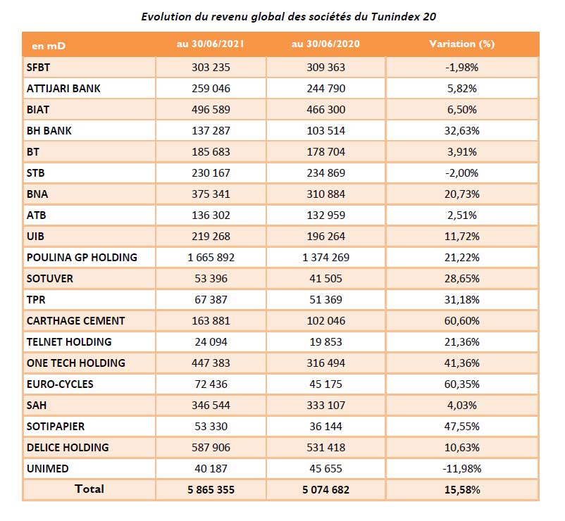 82% des sociétés ayant publié leurs indicateurs du deuxième trimestre 2021, soit 61 sur 74, ont amélioré leurs revenus par rapport à la même période de l’année précédente. Les 20 sociétés qui composent le Tunindex20 ont réalisé 5,9 milliards de dinars (ou 61% du revenu global), en hausse de 15,6% par rapport à la même période de l’année écoulée.