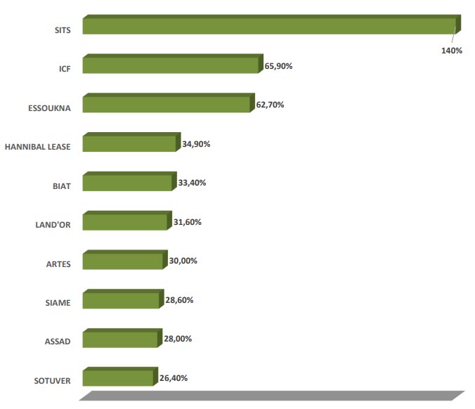 Les plus fortes hausses de revenus ont été réalisées par SITS (140%), ICF (+65,9%), ESSOUKNA (+62,7%), HANNIBAL LEASE (+34,9%) et BIAT (33,4%).