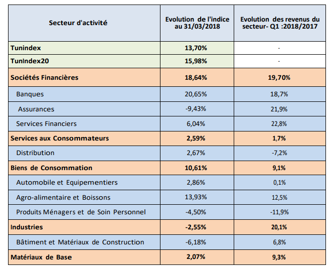 L’indice de référence de la Bourse de Tunis, TUNINDEX, a enregistré une progression de 13,7% durant le premier trimestre 2018 contre une hausse limitée à 0,99% durant la même période de 2017.