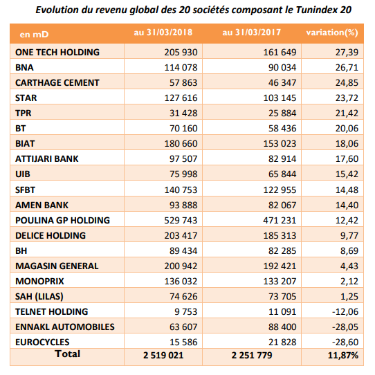Les 20 sociétés qui composent le Tunindex20, soit les entreprises les plus importantes de la Cote ont accaparé 65% du revenu global, soit 2,5 milliards de dinars, et enregistré une croissance globale de 11,9% par rapport au premier trimestre de l’année 2017.