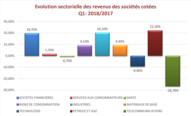 Six des neuf secteurs ont accru leurs revenus. Le secteur Pétrole et Gaz a réalisé la plus forte progression, avec 22,1% suivi par le secteur des sociétés financières avec 19,7%, contre une baisse des revenus du secteur de télécommunication de (-26,7%).