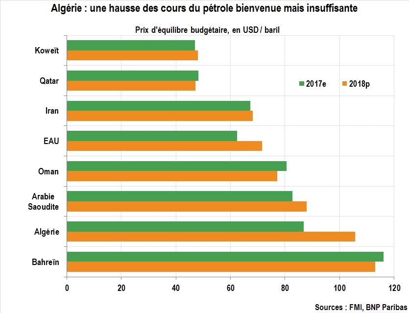 Le budget de 2018 marque une nette inflexion de la politique du gouvernement. Après deux années de consolidation, les dépenses budgétaires devraient augmenter fortement. Dès lors, l’Algérie aura besoin d’un baril à USD 105 pour restaurer l’équilibre de ses comptes publics, soit 20 dollars de plus qu’en 2017. C’est plus que pour ses pairs régionaux, soulignant la nécessité de poursuivre les réformes visant à réduire la dépendance du pays à l’égard de la manne pétrolière. Ces réformes attendront 2019 dans le meilleur des cas.