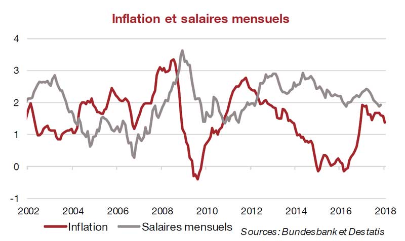 Malgré le dynamisme de l’emploi, l’inflation restera contenue. Les rémunérations réelles sont en forte progression dans l’industrie manufacturière, mais elles sont moins dynamiques dans les services et les emplois les moins qualifiés. Un grand nombre de travailleurs âgés et des personnes constituant le deuxième revenu d’un ménage occupent des emplois mal rémunérés (les «mini-jobs»).