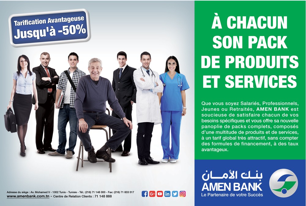 Pour de plus amples informations sur les avantages des Packs d’AMEN BANK, veuillez cliquer ici ou contacter le Centre de Relation Clients, au 71 148 888 ou vous rendre sur la page officielle Facebook d’AMEN BANK.