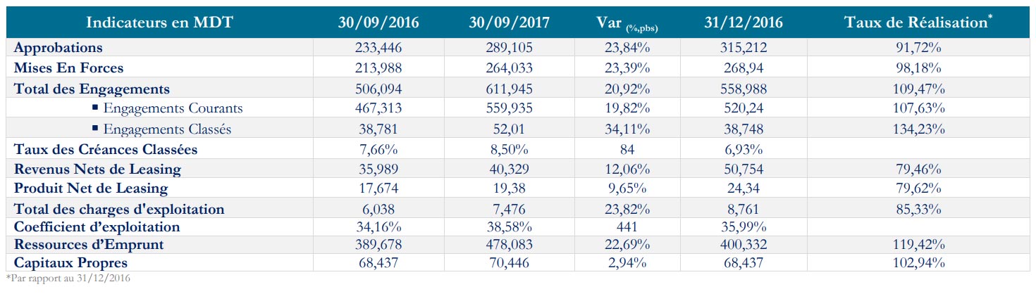 Courant la même période, la société de leasing enregistre une performance de 12,06% en termes des revenus nets de leasing s’établissant à 40,329 MDT infine. De l’autre coté du spectre, les charges financières nettes ont signalé un alourdissement de 14,38%, supporté par la compagnie. A cet effet, l’activité de l’ATL s’est soldée par un Produit Net de Leasing de 19,38 MDT au 30/09/2017, en évolution de 9,65% sur une année glissante.