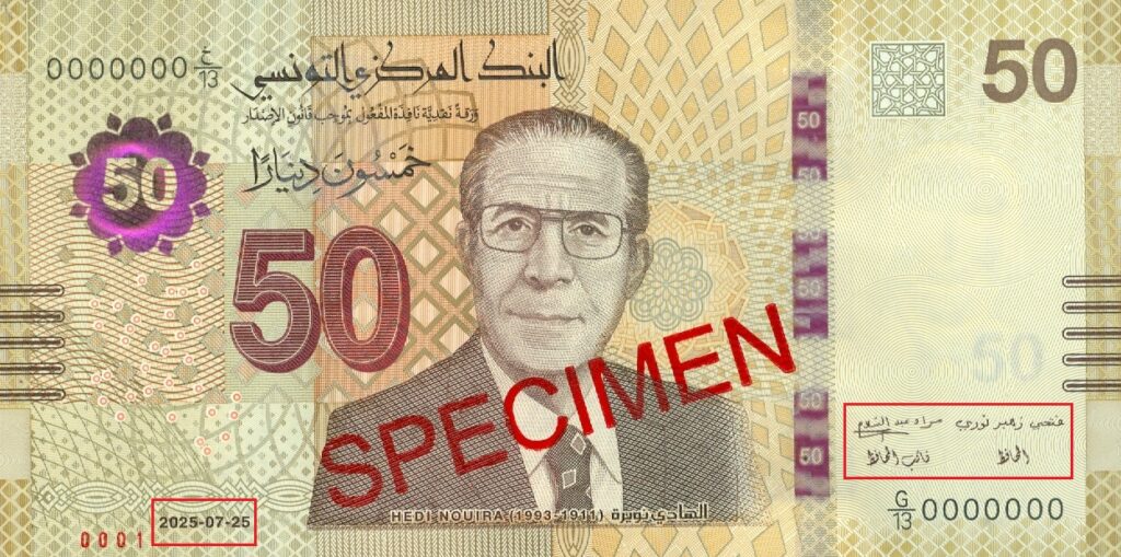 - Signatures officielles : celles du Gouverneur de la BCT, Fethi Zouhaier Nouri, et du Vice-Gouverneur, Mourad Abdessalem, figurent sur le nouveau billet.