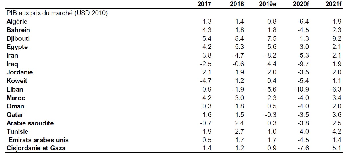 Perspectives : L’activité économique de la région Moyen-Orient et Afrique du Nord devrait se contracter de 4,2 % sous l’effet de la pandémie et de l’évolution du marché du pétrole, ce qui est loin de la croissance de 2,4 % prévue dans l’édition de janvier. En outre, une forte incertitude pèse sur ces prévisions. Les pays exportateurs de pétrole sont pénalisés par l’effondrement des prix du pétrole et des flambées de Covid-19, tandis que les importateurs de pétrole se ressentent de l’affaiblissement des économies avancées et des grands pays émergents, des perturbations causées par les mesures de riposte à la pandémie et de la baisse probable du tourisme.
