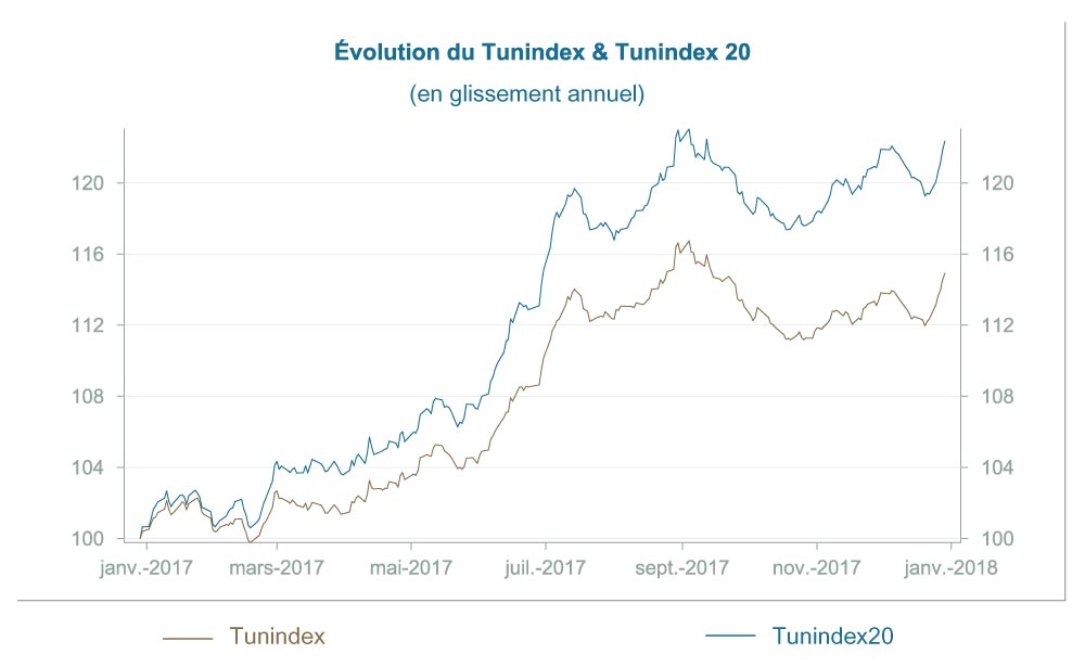 La Bourse de Tunis clôture l’ultime semaine de l’année 2017 dans le vert. Le Tunindex s’affermit de 2.27% à 6 281.83 points. La performance de l’indice phare depuis le début de l’année a atteint 14,45%. Suivant cette même trajectoire, le Tunindex 20, s’offre un gain de 2,49% à 2 822,58 points. Il affiche une performance annuelle de l’ordre de 21,54%. Le volume drainé courant la semaine a effleuré les 873.33 MDT dont 803.171 échangé sur la ligne DELICE HOLDING. La balance des variations est tirée vers le haut affichant 49 hausses contre 23 baisses.