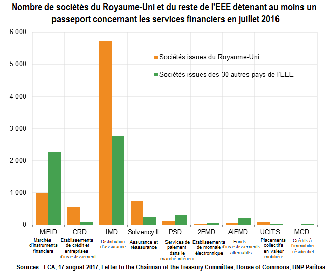 En 2016, 13 500 sociétés de l’EEE bénéficiaient d’au moins un passeport. S’il informe sur le nombre potentiel d’obstacles juridiques à la poursuite des activités transfrontalières, le nombre de passeports par activité ne renseigne pas sur l’ampleur et le type de flux financiers, ou encore sur le nombre d’emplois concernés par la perte du passeport européen. Avec le Brexit, le Royaume-Uni deviendra un pays tiers. Il devrait être soumis à des régimes d’équivalence accordés (ou non) pour une durée potentiellement limitée par les autorités compétentes du pays d’accueil.