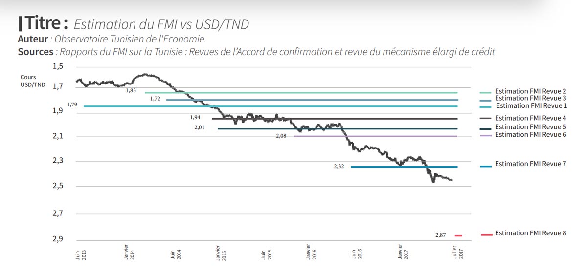 • Lors de la dernière revue, le FMI a estimé que le dinar devrait atteindre un taux de change de 1 USD pour 2,87 TND.
