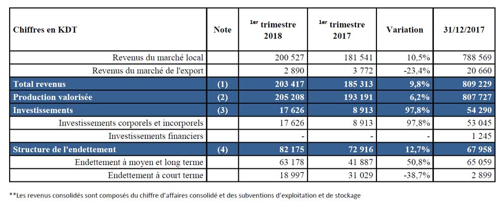 Le groupe a réalisé au 1er trimestre un revenu total de 203 417 KDT, soit une augmentation de 9,8 % par rapport au premier trimestre 2017. La production valorisée est déterminée selon la formule : Revenus +/- variation des stocks de produits finis et des encours. La production valorisée a augmenté de 6,2 %. Le niveau du stock de produits finis pour le pôle lait a baissé en passant de 35 328 KDT au 31/03/2017 à 22 383 KDT au 31/03/2018.