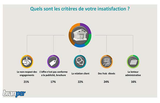 Répondant à la question : Quel est votre degré de satisfaction des services de votre banque ?, 29% des interviewés sont insatisfaits, 24% pas tellement et seulement 17% satisfaits. Pour être plus précis, la plateforme a posé la question suivante : quels sont les critères de votre insatisfaction ?, 24% des clients trouvent que les frais des banques sont élevés, 21% sont unanimes quant au non respect des engagements et 17% des clients estiment que l’offre n’est pas conforme à la publicité.