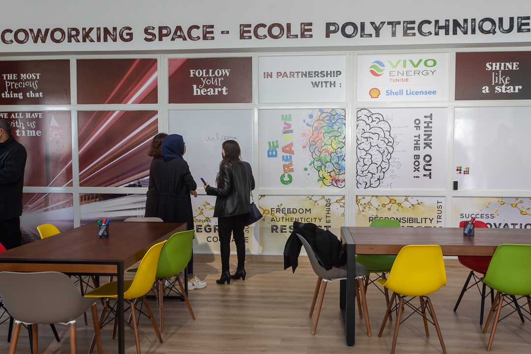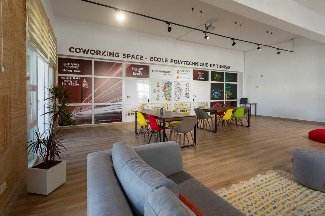 Ce nouveau Coworking Space a été conçu et développé pour être un espace de travail et de partage entre les élèves ingénieurs de l’Ecole Polytechnique de Tunisie. Il leur permet en effet de travailler en équipe sur des projets et de activités génératrices de valeur, mais également d’organiser des projections, des conférences en présentiel ou en ligne, de « brainstormer » et même d’entreprendre en groupe ! Intégrant des espaces de réunions formelles et informelles, de multiples espaces individuels. Il dispose de tout le matériel informatique nécessaire au bon déroulement des projets des étudiants : vidéoprojecteur et équipement de reprographie tous deux à la pointe de la technologie. Le Coworking Space de l’Ecole Polytechnique de Tunisie offre ainsi aux élèves ingénieurs de belles opportunités d’échange et de travail collaboratif.