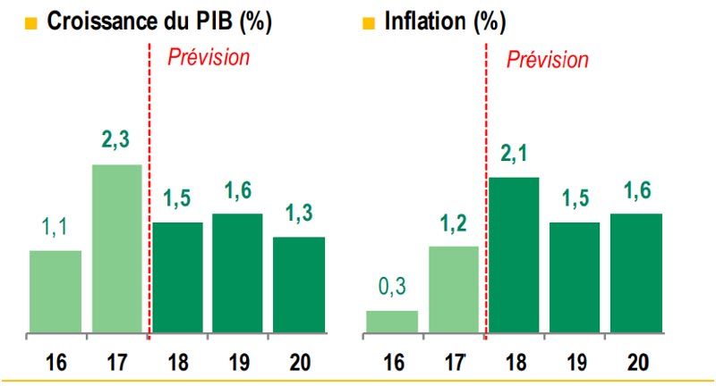 S’agissant du coup de frein à la croissance attendu au T4 (nous tablons désormais sur tout juste 0,2% t/t contre 0,6% début octobre), il est pour l’essentiel la conséquence du mouvement des « gilets jaunes » 2 , principalement de par son impact négatif sur la consommation des ménages (dont on s’attend à ce qu’elle progresse à peine, malgré les baisses d’impôts, et non plus rebondisse grâce à elles) mais pas seulement. L’investissement des entreprises devrait aussi en pâtir (accentuant le contrecoup attendu sur l’investissement en produits manufacturés post-introduction de la norme WLTP), de même que les exportations (via les moindres dépenses de tourisme qui restreindront le fort rebond attendu porté par les livraisons d’Airbus et divers autres gros contrats). Une baisse du PIB au T4 ne peut être exclue mais ce n’est pas le scénario le plus probable. Sur l’ensemble de l’année 2018, nous prévoyons que la croissance atteigne 1,5%.