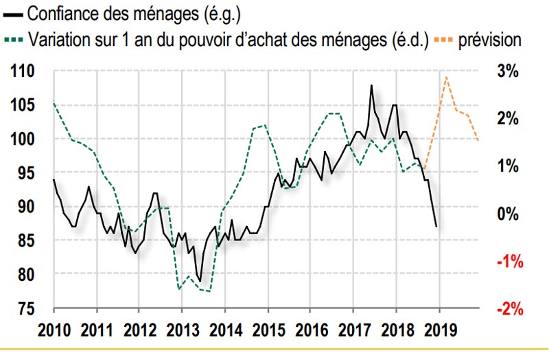 Le second facteur de résistance est l’impulsion positive de la politique économique et budgétaire. Cette impulsion transite en partie par le soutien apporté aux entreprises via la transformation du CICE en baisse de charges. Elle transite aussi, et pour une plus large part, par l’effet positif attendu sur la consommation des ménages des baisses d’impôts votées dans le budget 2018, auxquelles sont venues s’ajouter les mesures du plan de soutien au pouvoir d’achat des ménages modestes annoncées le 10 décembre par le président de la République en réponse au mouvement des « gilets jaunes »