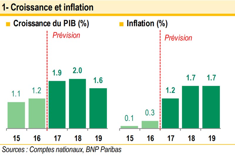 Portée par une demande intérieure et une croissance mondiale robustes, l’économie française continue d’avancer à un bon rythme, qui s’accélère même au moment d’aborder 2018. Sa croissance atteindrait 2% en moyenne cette année, après 1,9% en 2017. Clé de voute de notre scénario, l’emploi privé verrait sa dynamique préservée, voire renforcée. Il constituerait le principal facteur de soutien au pouvoir d’achat des ménages, alors que l’effet net des mesures fiscales est sujet à débat et s’avèrerait, somme toute, limité. Le chômage est appelé à reculer davantage, et la consommation des ménages à retrouver le dynamisme qui lui manquait jusqu’ici.
