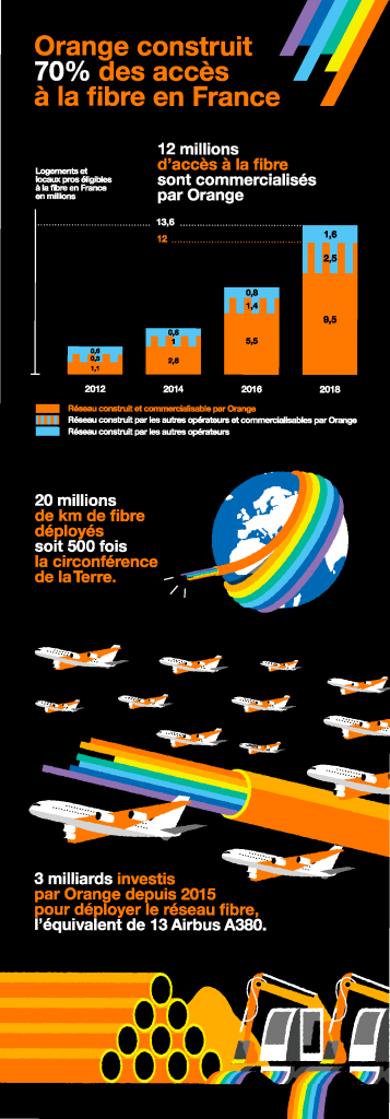 En 2019, Orange poursuit sa stratégie responsable d’aménagement numérique des territoires et confirme son rôle essentiel dans le déploiement du très haut débit. Orange réalise plus de 70% de la construction de fibre en France et contribue ainsi fortement à dynamiser toute une filière industrielle. Orange a investi 9 milliards d’euros dans le déploiement des réseaux en France entre 2015 et 2018 dont 3 milliards dédiés à la fibre.