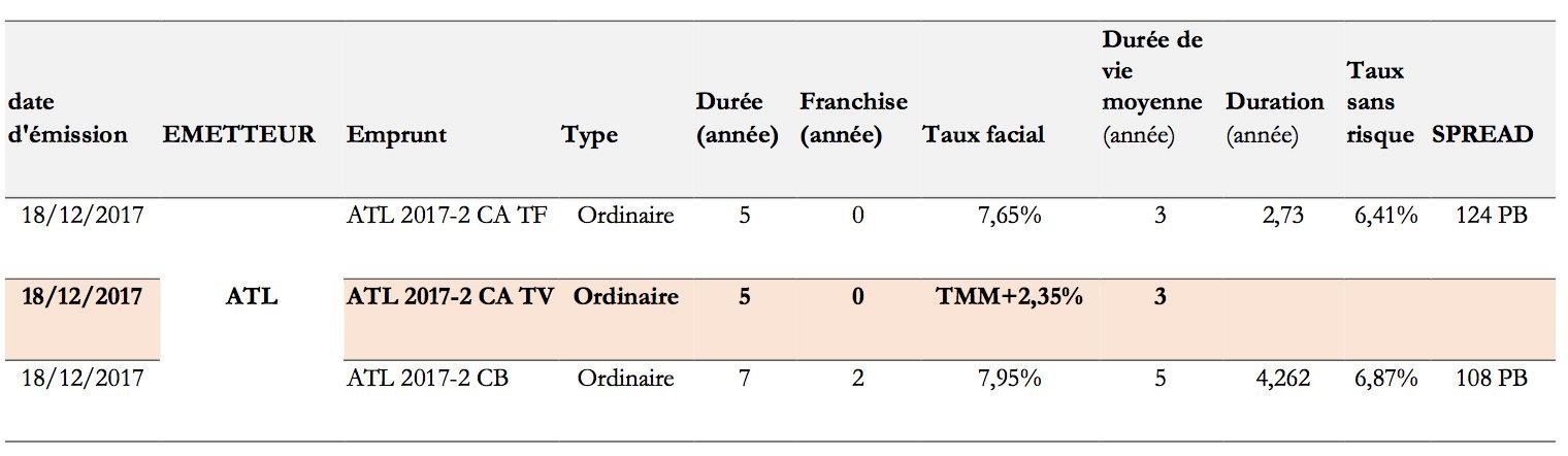 Par ailleurs, ATL émet un emprunt obligataire d’un montant de 30 millions de dinars sous deux catégories. La première catégorie est remboursable sur cinq ans en amortissement constant et au taux fixe de 7,65% ou au taux variable de TMM+2,35% au choix du souscripteur. La deuxième catégorie est d’une durée de sept années amortissable sur cinq ans constant à partir de la troisième année au taux fixe de 7,95%. La période de souscription s’étale du 18/12/2017 au 02/03/2018. Au cas où le présent emprunt n’est pas clôturé à la date limite du 02/03/2018, les souscriptions seront prolongées jusqu’au 16/03/2018 avec maintien de la date unique de jouissance en intérêts.
