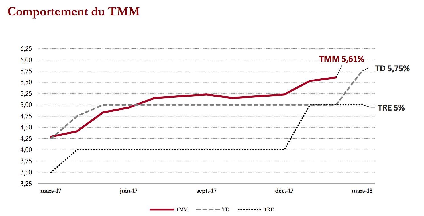 Lors de son conseil d’administration du 5/03/2018, la BCT a décidé d’augmenter le taux directeur de 75 points de base le portant ainsi de 5% à 5,75% l’an. Rappelons que le conseil avait déjà décidé fin décembre 2 017 d’élargir le corridor à 100 points de base de part et d’autre du taux directeur de la BCT. Ce spread étant inchangé, le taux de facilité permanente de crédits se monte ainsi à 6,75%. En tenant compte de l’insuffisance de liquidité du marché traduite par un volume de refinancement global qui dépasse les 12 milliards de dinars, le TMM devrait facilement avoisiner les 6,5% à court terme.