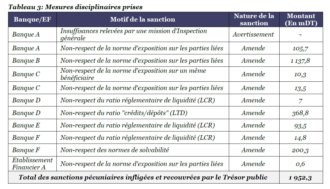 Pour garantir la solidité du système bancaire, la BCT a relevé les exigences en matière de fonds propres et de provisions. Ces mesures ont été accompagnées d’un durcissement des sanctions financières, avec un montant total d’amendes de 1 952 millions de dinars tunisiens en 2023. Les infractions les plus sanctionnées concernent le non-respect des normes d’exposition sur les parties liées et le dépassement du ratio crédits/dépôts. Ces sanctions démontrent la détermination de la BCT à garantir le respect des règles et à préserver l’intégrité du système financier.