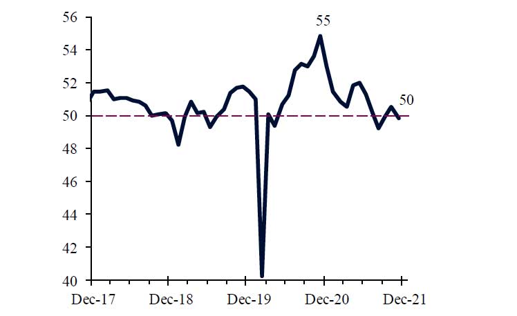 Par conséquent, la reprise en Chine perd de son élan plus rapidement que dans les autres grandes économies depuis le deuxième trimestre 2021. L’indice directeur des achats (PMI) de l’industrie manufacturière chinoise, un indicateur basé sur une enquête qui détermine si plusieurs composantes de l’activité se sont améliorées ou détériorées par rapport au mois précédent, a atteint un pic de 55 en novembre 2020, avant de glisser progressivement vers 50 en novembre 2021 (graphique 1).