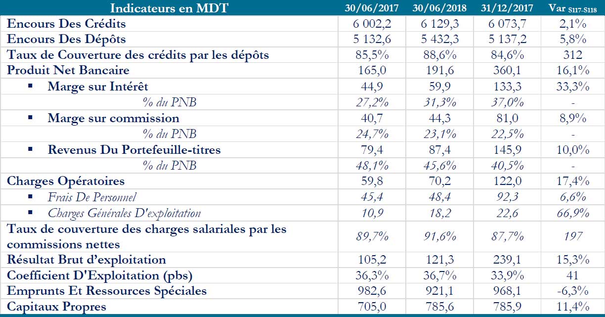 Quant aux crédits octroyés à la clientèle, ils ont légèrement augmenté de 2,1%, s’établissant à 6 129,3 MDT au 30/06/2018 contre 6 002,2 MDT au 30/06/2017. Dans ce sillage, le taux de couverture des crédits par les dépôts est passé de 85,5% à fin Juin 2017 à 88,6% à fin Juin 2018, soit une amélioration de 312 pbs.