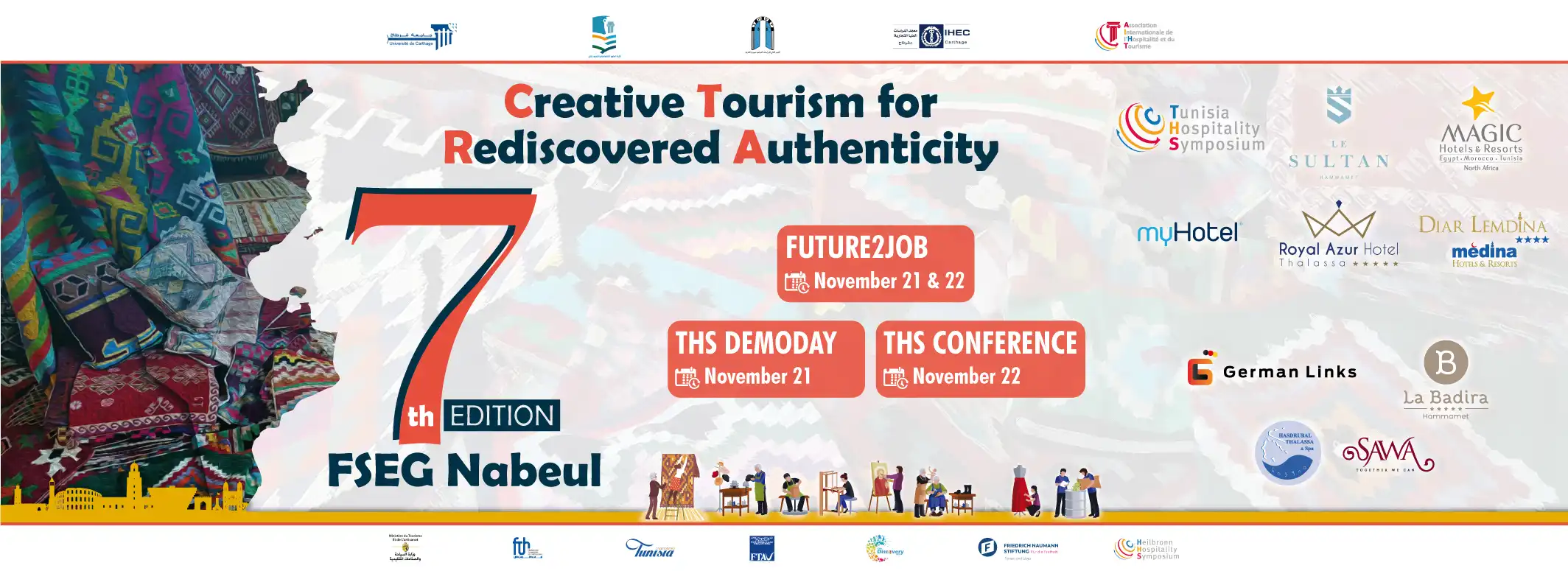 La 7e édition du Tunisia Hospitality Symposium (THS), qui se tiendra les 21 et 22 novembre 2023 à la Faculté des Sciences Économiques et de Gestion de Nabeul (FSEG Nabeul), est orchestrée par un consortium d’organisateurs, à savoir l’Association Internationale de l’Hospitalité et du Tourisme (AIHT), l’Université de Carthage, l’IHEC de Carthage, La FSEG de Nabeul, L’IHET de Sidi Dhrif, et le club Discovery HEC. Ces institutions s’unissent en partenariat avec l’ONTT, la FTH, et la FTAV, et bénéficient du soutien généreux de la Fondation Friedrich Naumann For Freedom.