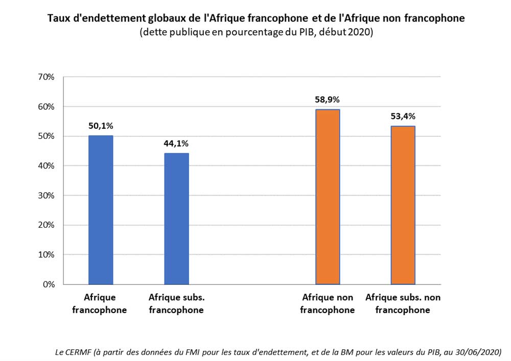 L’Afrique francophone est d’ailleurs globalement la partie la moins endettée du continent, avec un taux d’endettement global de 50,1 % du PIB pour cet ensemble de 25 pays début 2020, et de 44,1 % pour sa partie subsaharienne composée de 22 pays (en tenant compte de la dette publique et du poids de chacune de leurs économies, selon les données disponibles mi-2020). Pour le reste du continent, le taux s’établit à 58,9 % pour l’ensemble de l’Afrique non francophone, et à 53,4 % pour sa partie subsaharienne. Le niveau d’endettement global de l’Afrique francophone est d’ailleurs largement inférieur à celui de la majorité des pays développés.