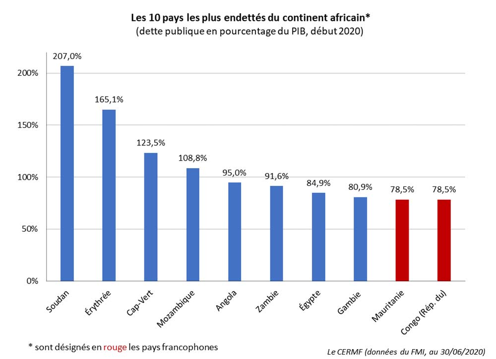 Selon les dernières statistiques du FMI, les dix pays africains affichant le taux d’endettement le plus élevé début 2020 sont les suivants : le Soudan, avec une dette publique équivalant à 207 % du PIB, l’Érythrée (165,1 %), le Cap-Vert (123,5 %), le Mozambique (108,8 %), l’Angola (95,0%), la Zambie (91,6 %), l’Égypte (84,9%), la Gambie (80,9%), la Mauritanie (78,5 %) et la République du Congo (ou Congo-Brazzaville, 78,5 %).