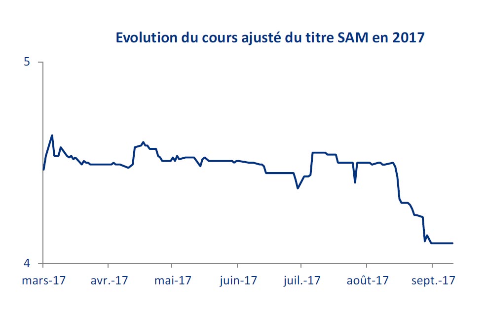 Le titre avait été introduit en bourse le 23 mars 2017 a un niveau de 5.200 DT et cote aujourd’hui à 4.100 DT, marquant un recul de -6.7% depuis son entrée en bourse, après ajustement de l’augmentation de capital et du détachement de dividende. L’Assemblée Générale Ordinaire avait approuvé la mise en paiement d’un dividende de 0,300 DT par action au titre de l’exercice 2016 représentant aujourd’hui un yield appréciable de 7.3% pour une moyenne globale du marché de 3.2%. Aujourd’hui, le titre est valorisé à un P/E2017e de 9.7x contre une moyenne internationale de 15.5x* sur son secteur. Malgré un parcours boursier mitigé et une rentabilité attendue en baisse en 2017, la société affiche néanmoins un bon niveau de valorisation et des perspectives prometteuses à moyen/long terme. Nous restons dans l’attente des réalisations de 2017.