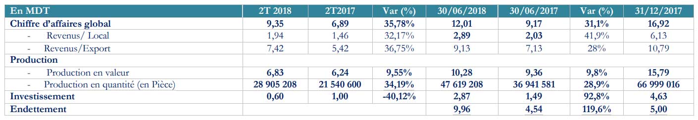 - Une augmentation du chiffre d’affaires local de 41,90% pour s’établir à 2,89 MDT à fin juin 2018.