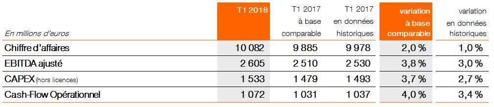 La croissance de l’EBITDA ajusté du 1er trimestre 2018 confirme la tendance positive de l’année 2017. Sur les activités télécoms, l’EBITDA ajusté progresse de +4,4% et la marge d’EBITDA s’améliore de +0,6 point.
