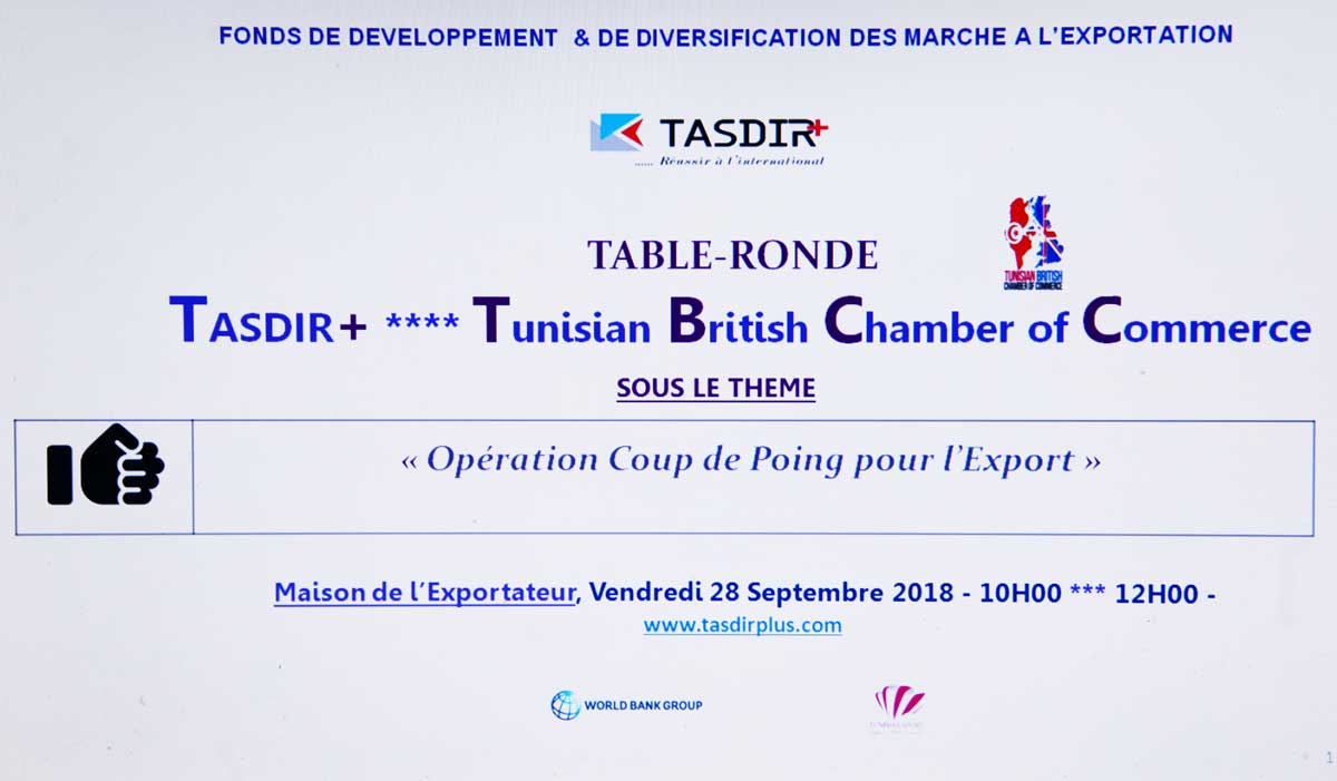 La Chambre de Commerce Tuniso Britannique (TBCC) et le Fonds pour le développement et la Diversification des Marché à l’Exportation TASDIR+ ont organisé vendredi 28 Septembre 2018 à Tunis une table ronde sous le thème : « Opération Coup de Poing pour l’Export ».