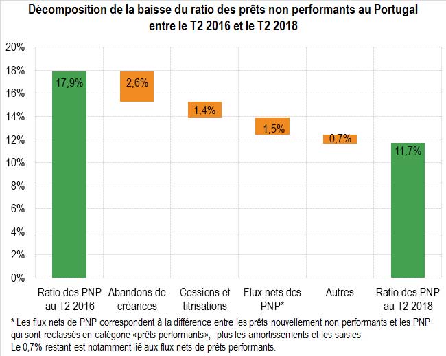 Selon les données de la Banque du Portugal, la baisse du ratio des PNP résulte à hauteur de 42% d’abandons de créances, tandis que les cessions et titrisations y concourent à 23%. Ainsi, près des deux tiers de l’assainissement du bilan des banques portugaises ont procédé d’une sortie des PNP du système bancaire.