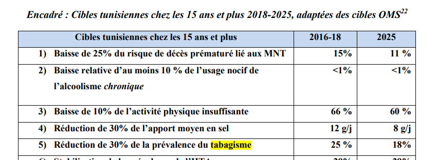 Dans le cadre du projet de la Convention-cadre de l’OMS pour la lutte antitabac (FCTC) 2030, l’OMS et la FCTC de l’OMS ont apporté leur soutien aux efforts de la Tunisie en matière de prévention et de contrôle du tabagisme. Plusieurs actions ont été entreprises, notamment la création d’un réseau multisectoriel engagé pour réviser la loi globale, un décret interdisant de fumer dans les espaces publics et un arrêté ministériel pour adopter des avertissements sanitaires graphiques. De plus, un protocole pour la conception et l’évaluation des étiquettes d’avertissement sanitaire spécifiques aux produits du tabac a été élaboré, et le modèle d’investissement pour le contrôle du tabac a été diffusé dans le cadre d’une vaste campagne de sensibilisation. Malgré ces efforts, les résultats restent mitigés puisque le taux de tabagisme n’a pas significativement diminué au fils des ans.