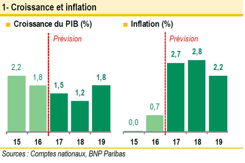 Le Brexit aura eu pour premières conséquences de faire chuter la livre, de renchérir les prix des biens importés et de pénaliser ainsi le pouvoir d’achat de ceux qui l’ont voté. L’inflation, qui devrait connaitre un pic à 3% en début d’année 2018, dépasse depuis plusieurs trimestres la progression des salaires, qui baissent donc en termes réels (graphique 2). Si la consommation a pu se maintenir jusqu’ici (elle a tout de même fortement ralenti en 2017) c’est parce que l’emploi a bien résisté et que les ménages ont puisé dans leur épargne. Ces derniers se montrent toutefois de plus en plus pessimistes dans les enquêtes. En décembre 2017, le principal indice de confiance des consommateurs, calculé par l’agence GfK, tombait à son plus bas niveau depuis quatre ans ; les intentions d’épargner s’inscrivaient en forte hausse. En dépit d’un chômage faible (4,2% de la population active), supposé tirer les revenus vers le haut, les Britanniques se montrent réservés quant à l’évolution de leur situation financière. Ils freineraient leurs achats en conséquence. Côté chefs d’entreprise, les indices du climat des affaires ne se sont pas autant détériorés, opérant même un léger rebond. L’avancée, fût-elle laborieuse, des négociations en vue du divorce avec l’UE, l’espoir qu’une période de transition rende celui-ci moins brutal, y sont sans doute pour quelque chose (cf. infra). Le pire n’étant pas pour tout de suite, les investissements ne sont pas coupés, se contentant juste de freiner. L’économie évite la récession, et avance au ralenti.