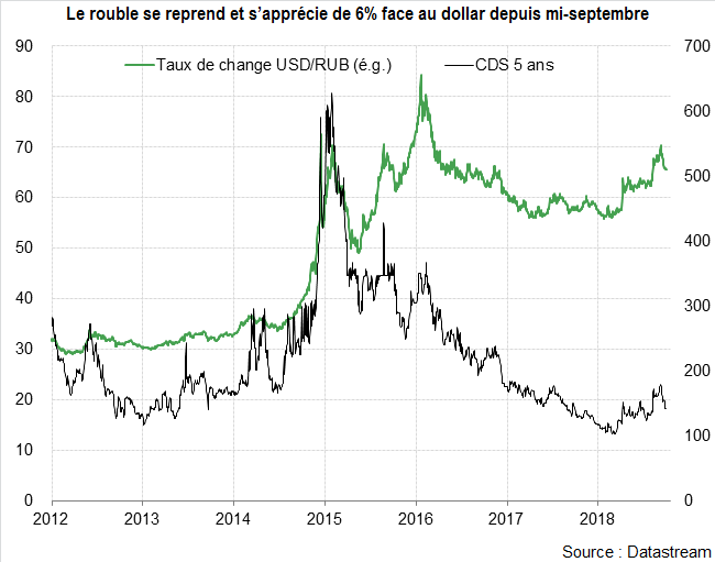 Entre avril et mi-septembre 2018, le rouble s’est déprécié de près de 18% face au dollar malgré l’amélioration des fondamentaux macroéconomiques russes. Ces pressions à la baisse reflètent les sorties de capitaux étrangers liées à l’annonce de nouvelles sanctions américaines en avril, puis en août, et au risque qu’elles soient encore durcies après les élections de mi-mandat. La part de la dette souveraine détenue par les investisseurs étrangers a ainsi baissé à 26,6% au 1er septembre (contre 34,5% en avril).
