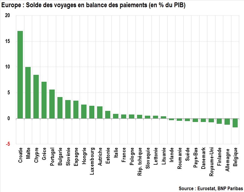 Toutefois, les Européens réalisant leurs dépenses principalement dans d’autres pays de l’Union, le solde net des voyages en balance des paiements de l’UE n’atteignait que 26 milliards d’euros. Le tourisme en provenance de l’étranger est une source importante de revenus en particulier pour les petites économies du bassin méditerranéen comme la Croatie, Malte et Chypre. Les pays du Nord et de l’Ouest de l’Europe ont, quant à eux, enregistré des déficits de leur balance des voyages.