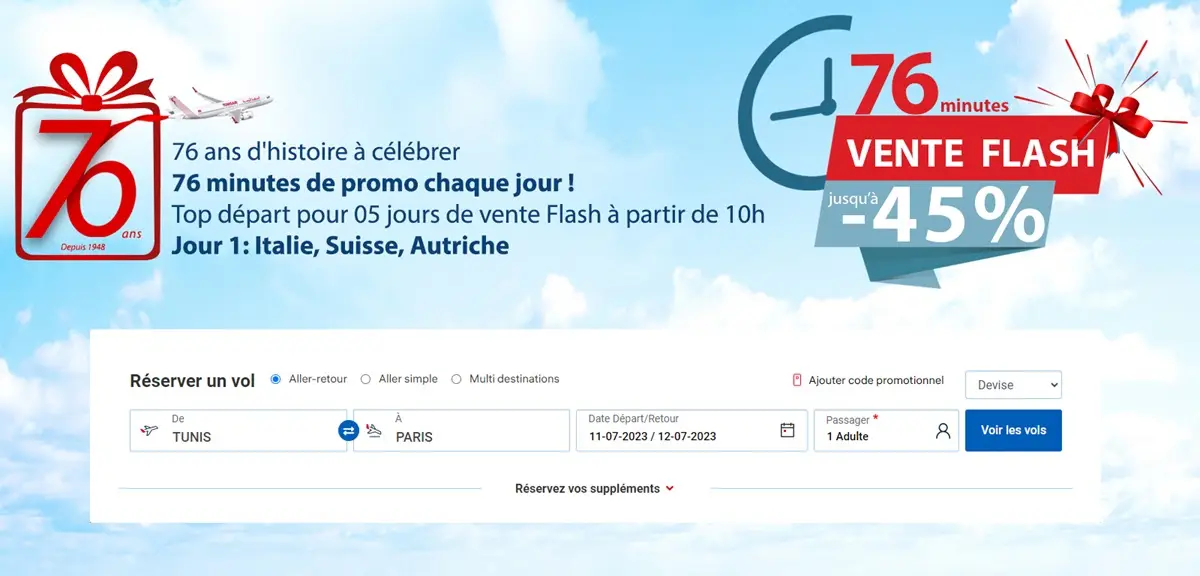 À l’occasion de son 76e anniversaire, Tunisair continue de gâter ses passagers avec une vente flash exceptionnelle. Après un démarrage en fanfare ce lundi, la compagnie nationale a décidé d’élargir l’accès à ces offres en doublant les créneaux horaires disponibles, permettant ainsi à encore plus de voyageurs de bénéficier de tarifs exclusifs.