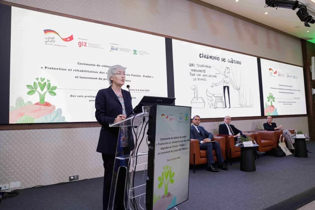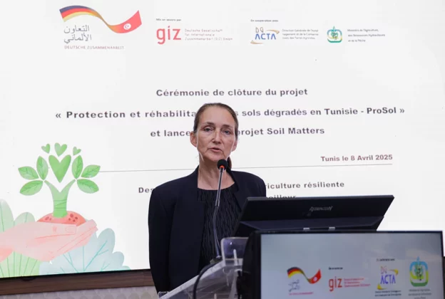 Un chapitre important de la coopération tuniso-allemande pour la protection de l’environnement et le développement agricole durable s’est achevé le 8 avril 2025 à Tunis, avec la cérémonie de clôture du projet « Protection et réhabilitation des sols dégradés en Tunisie » (ProSol). Cet événement de haute importance a réuni des figures clés telles que M. Haikel Hechlef, chef de cabinet du ministre de l’Agriculture, des Ressources hydrauliques et de la Pêche (MARHP), Son Excellence Madame Elisabeth Wolbers, ambassadrice de la République fédérale d’Allemagne en Tunisie, et Madame Ariane Borgsted, Directrice régionale de la GIZ. La rencontre a également rassemblé un large éventail d’experts, de partenaires institutionnels, de représentants régionaux et d’acteurs majeurs du secteur agricole tunisien.