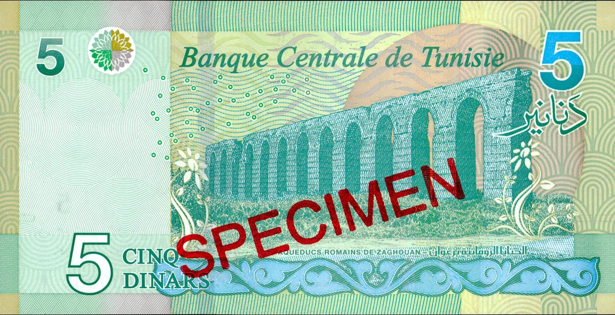 - Micro-lettres : impression en micro-lettres du texte « «BANQUE CENTRALE DE TUNISIE» au-dessous de la photo des Aqueducs Romains de Zaghouan et du texte «CINQ DINARS» dans des endroits des bords gauche et droit du billet.