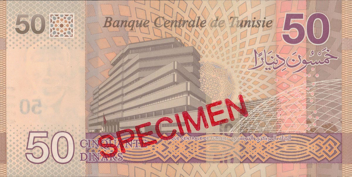 - En bas à gauche, le chiffre «50» et à sa droite le texte : «CINQUANTE DINARS».